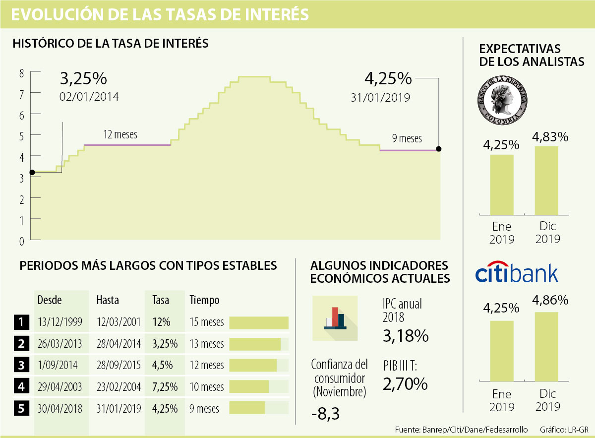 “El cierre del IPC de 2018 (3,18%) fue de enorme éxito y los pronósticos de inflación son buenos. Además, seguimos esperando que la economía crezca este año 3,5%. Lo único que me preocupa es la posible volatilidad que se pueda generar”, manifestó el gerente del Banco de la República, Juan José Echavarría, en la rueda de prensa posterior a la reunión.