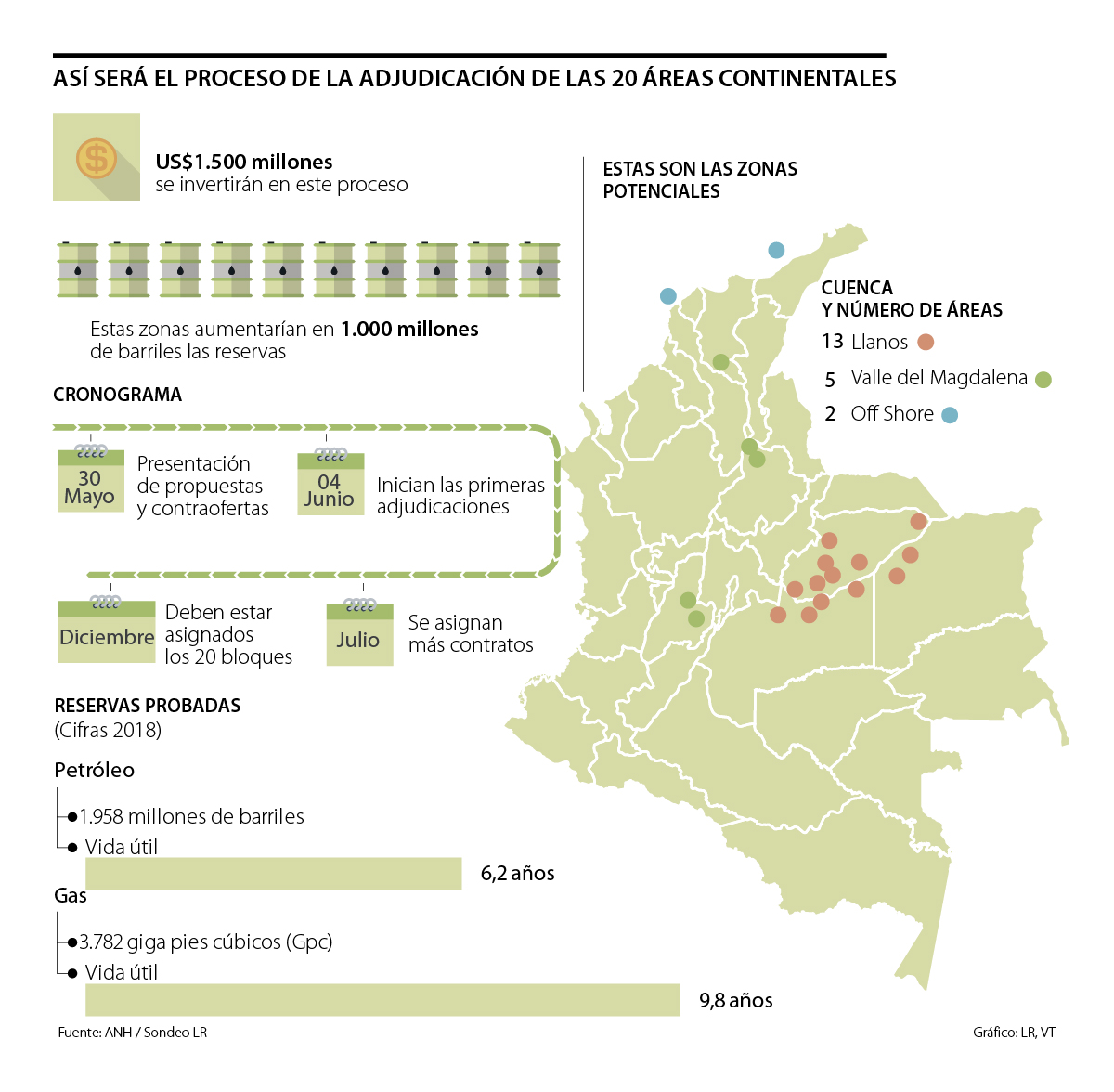 La apertura de esta nueva ronda de asignación de áreas se da después de cuatro años en los que no se ha firmado ningún contrato de exploración y producción de hidrocarburos. Con este nuevo proceso, la ANH estima que las reservas del país podrían aumentar en 1.000 millones de barriles, un escenario que le caería muy bien al país ahora que su abastecimiento de gas tan solo alcanza para 9,8 años (3.782 giga pies cúbicos) y 6,2 años de petróleo (1.958 millones de barriles).