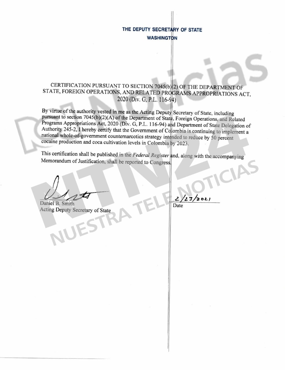 Sobre la certificación de Estados Unidos, el ministro de Defensa, Diego Molano Aponte, expresó que “para el gobierno en Colombia en cabeza del Presidente Iván Duque la certificación otorgada por el secretario de Estado, Antony Blinken, ratifica el compromiso indeclinable que tiene el país de luchar contra el narcotráfico”.