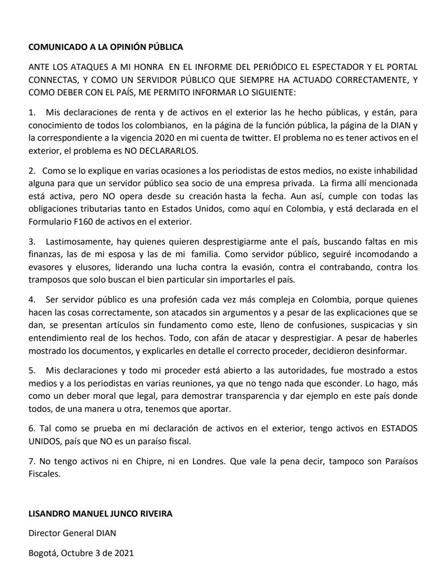 Así mismo, agregó que dicha sociedad que tiene con su esposa en EE.UU. ha declarado ante el IRS (Internal Revenue Service) los años fiscales 2017, 2018, 2019 y 2020. "No se ha declarado el año 2021, toda vez que el cierre fiscal es el 31 de diciembre de 2021. Las declaraciones fueron expuestas ante el diario El Espectador", señaló.