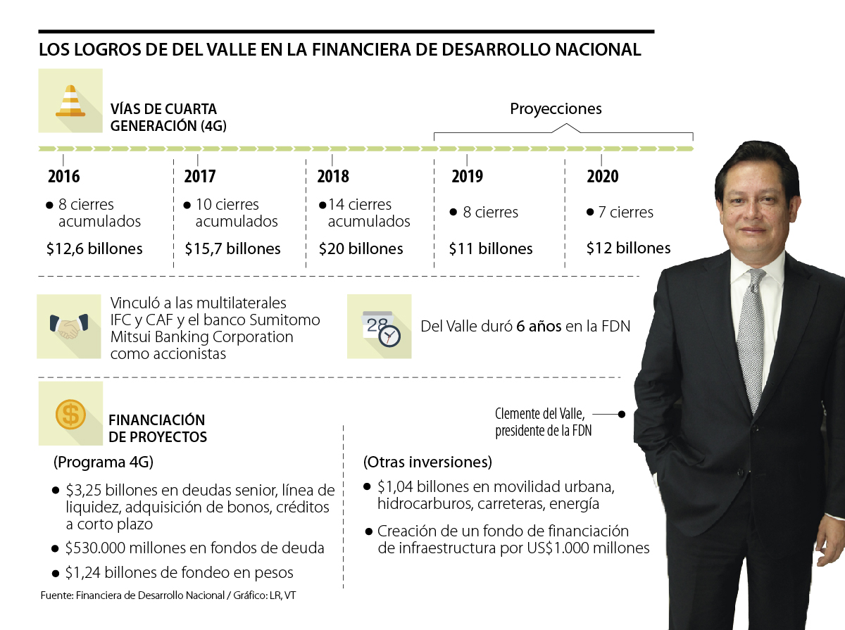 Los 15 cierres financieros alcanzados en el programa 4G, los $20 billones desembolsados en estas vías, la creación de un fondo de financiación de infraestructura por US$1.000 millones y la consolidación de la Financiera de Desarrollo Nacional (FDN) son algunos de los hitos alcanzados por Clemente del Valle, quien, tras estar a cargo de la presidencia de la entidad por más de seis años, ayer anunció su paso al costado.