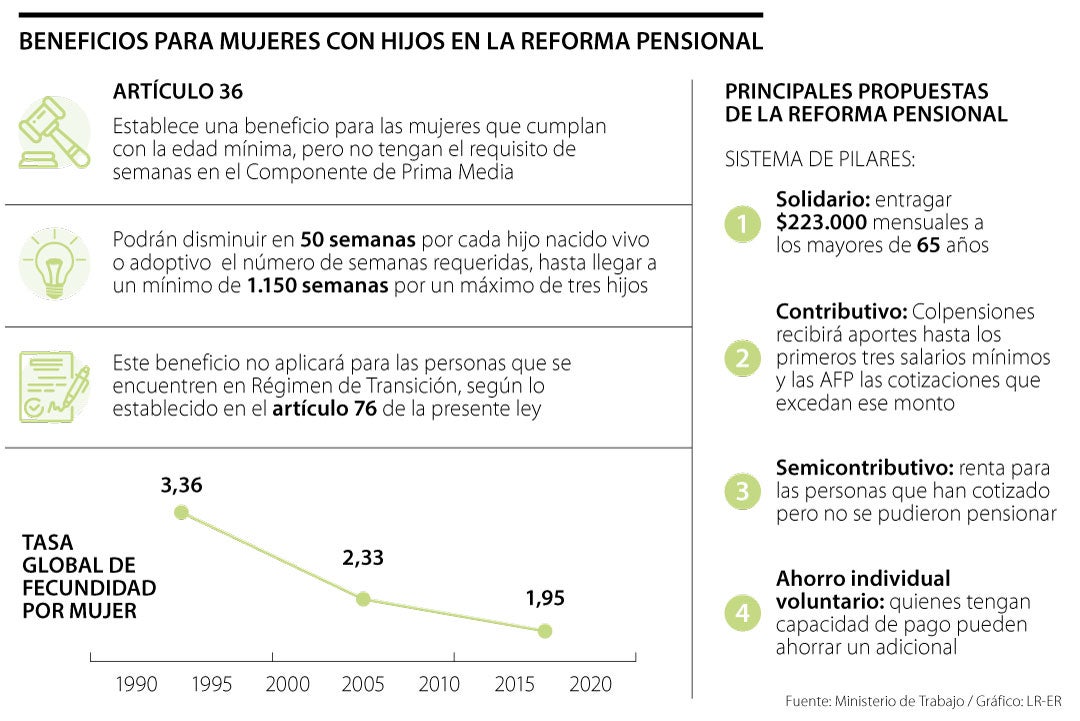 En el artículo 36 del proyecto de reforma pensional radicado ante el Congreso de la República, se establece un beneficio en semanas para las mujeres que tengan hasta tres hijos.