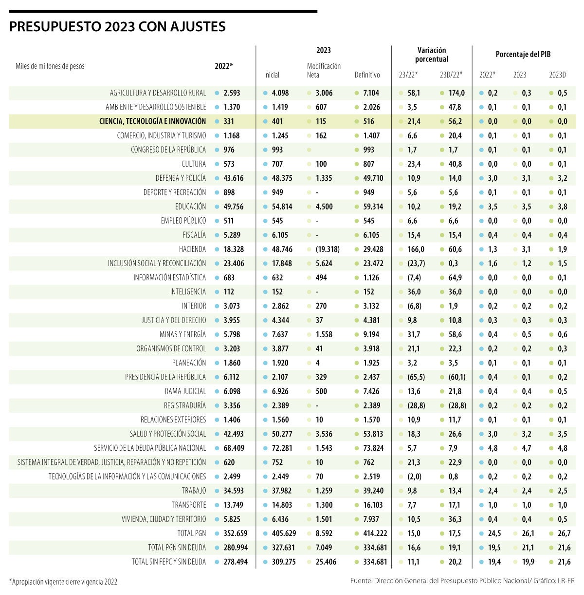 Por el lado de la adición presupuestal, la cartera de Ciencia tendrá un aumento en sus recursos de $115.000 millones, y pasó de $401.000 millones asignados para 2023, a más de $516.000 millones para su inversión.