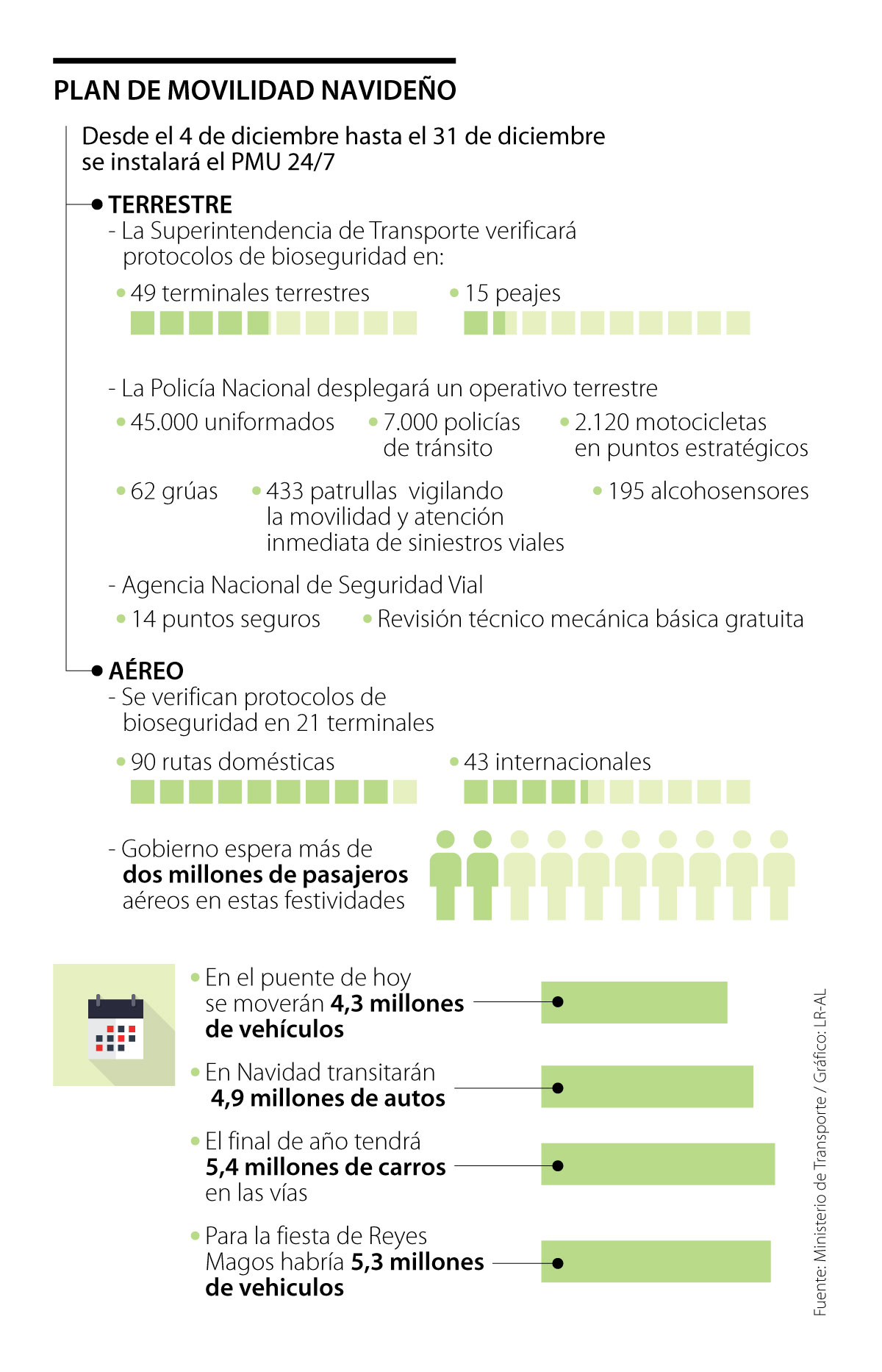 Por otra parte, la cartera reportó que, según las proyecciones de la Dirección de Tránsito de la Policía Nacional, se pronostica la movilización de alrededor de 20 millones de automotores en las fiestas. De estos, se espera que para el puente festivo del 8 de diciembre se movilicen 4.362.018 vehículos y para la Navidad (24 al 28 de diciembre) se proyectan 4.920.000.