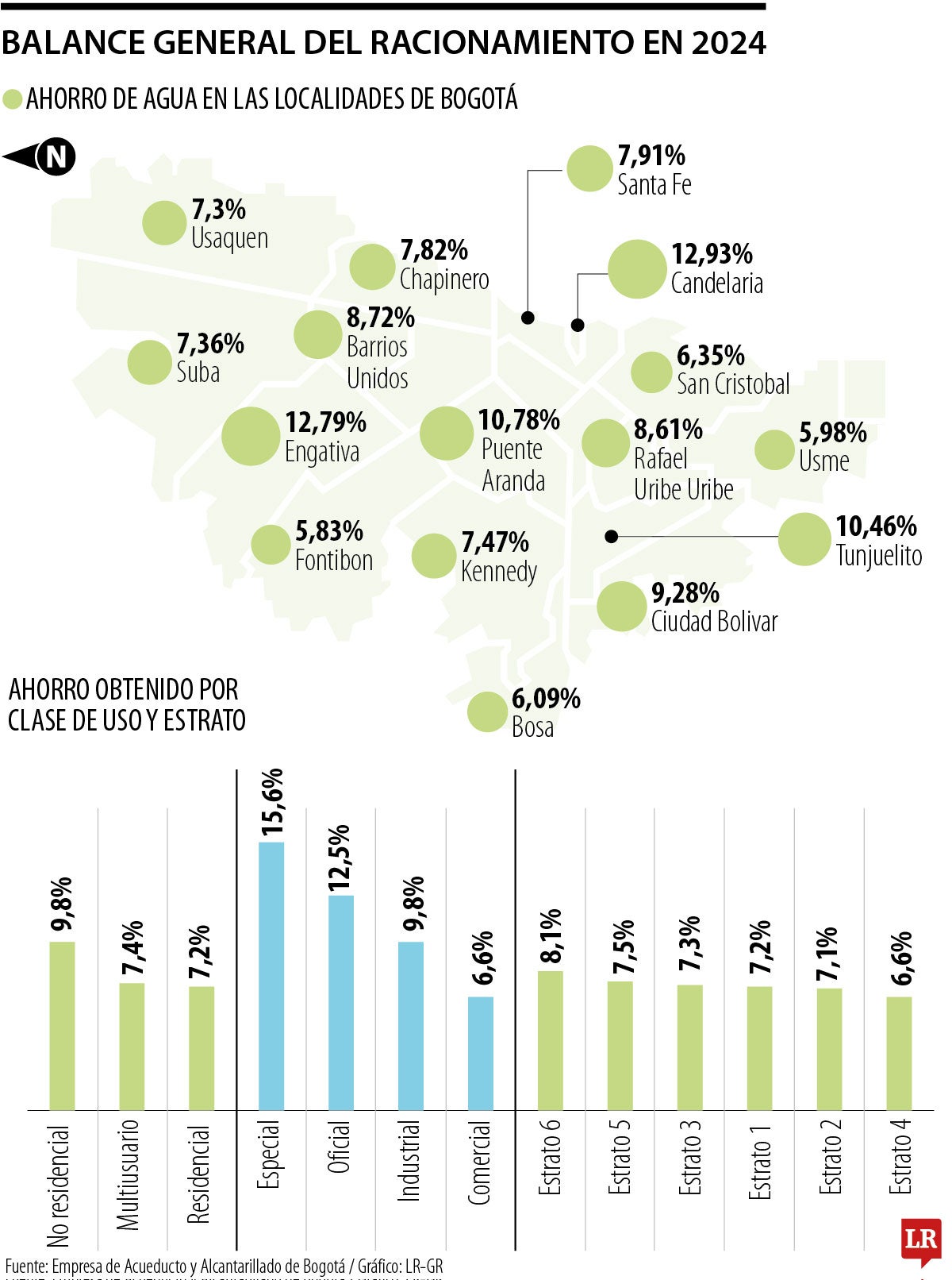La entidad informó que las localidades que más ahorro promedio por usuario han logrado son Candelaria (12,93%), Engativá (12,79%) y Puente Aranda (10,78%), por otra parte, las localidades con menos ahorro son Fontibón, Usme y Bosa con un porcentaje inferior al 6% de disminución en consumo.