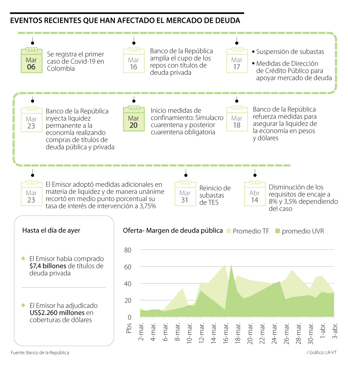 “Estas medidas van en la dirección correcta, pero resultan insuficientes debido a la magnitud del choque y la nueva realidad de los mercados. Preocupa de manera importante la dinámica del mercado de títulos de deuda pública TES en días recientes. Los volúmenes de negociación han caído de forma importante, mientras la diferencia entre los precios de compra y venta (el bid-offer spread) se han ampliado, sugiriendo que hay problemas de liquidez en el mercado”, señaló López.