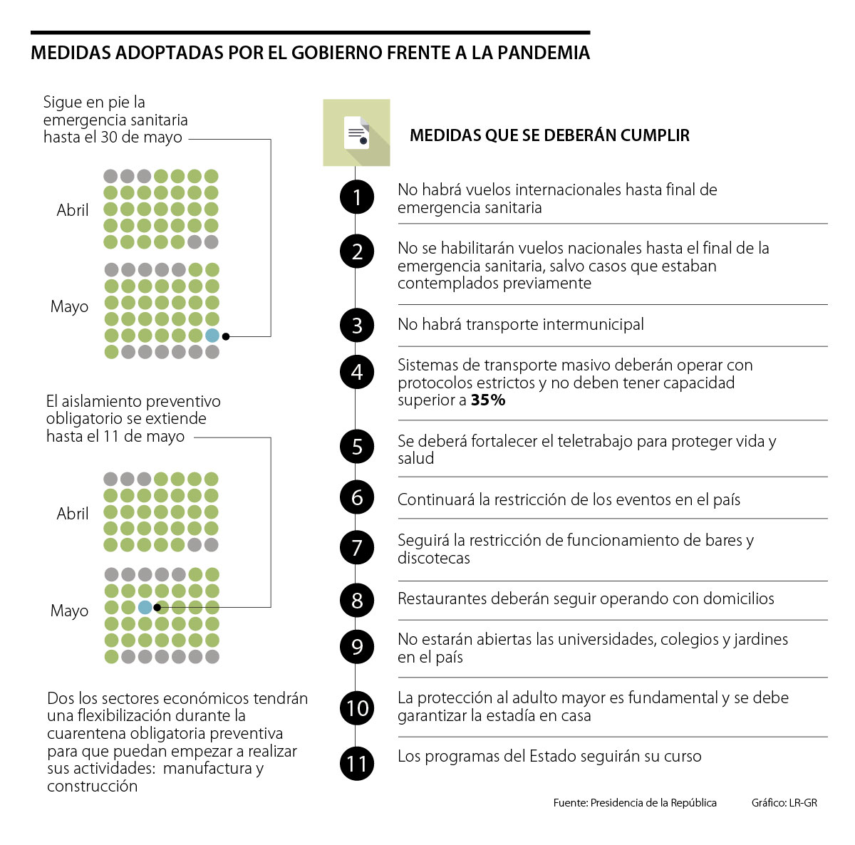 El mandatario afirmó que “tenemos una emergencia sanitaria hasta el 30 de mayo y debemos tener claro que el principio general con el que estamos trabajando es el aislamiento preventivo, por eso lo fuimos fortaleciendo gradualmente. Bajo el principio que tenemos hoy, debemos mantener la emergencia sanitaria y hemos tomado la decisión de extender el aislamiento hasta el 11 de mayo”. Pero aclaró que si no hay avances y “vemos afectaciones en las capacidades del sistema de salud, debemos tomar decisiones importantes”.