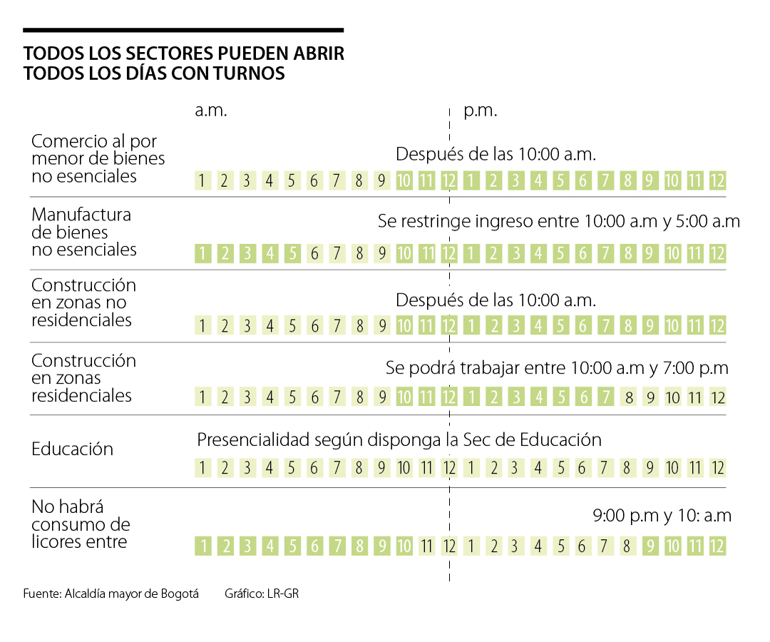 La construcción en zonas residenciales tendrá un horario de trabajo entre 10:00 a.m. y 7:00 p.m. y en zonas no residenciales se deberán establecer turnos de ingresos para después de las 10:00 a.m. Para las instituciones educativas los horarios quedarán predeterminados según la determinación que dé la Secretaría de Educación.