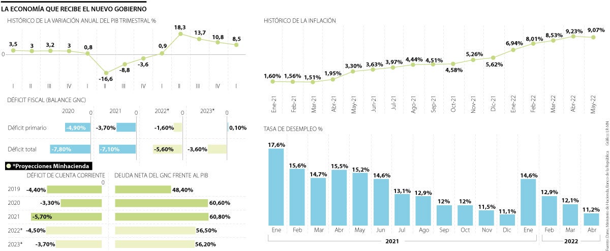 La economía ha mostrado un alto dinamismo. Esto permitió que a cierre de 2021, el crecimiento fuera de 10,7% y en el primer trimestre este haya sido de 8,5%. Ocampo señala que el reto será mantener estas buenas cifras, aunque cuando ingrese el nuevo gobierno el país va a estar en medio de una desaceleración por cuenta de la alta inflación y la tasa de intervención del Emisor que subirá cada vez más. De acuerdo con la Encuesta de Expectativas del banco central, desde septiembre y hasta febrero de 2023, esta estaría en 8,5% para contener la inflación. Esto afectará el consumo de los hogares.