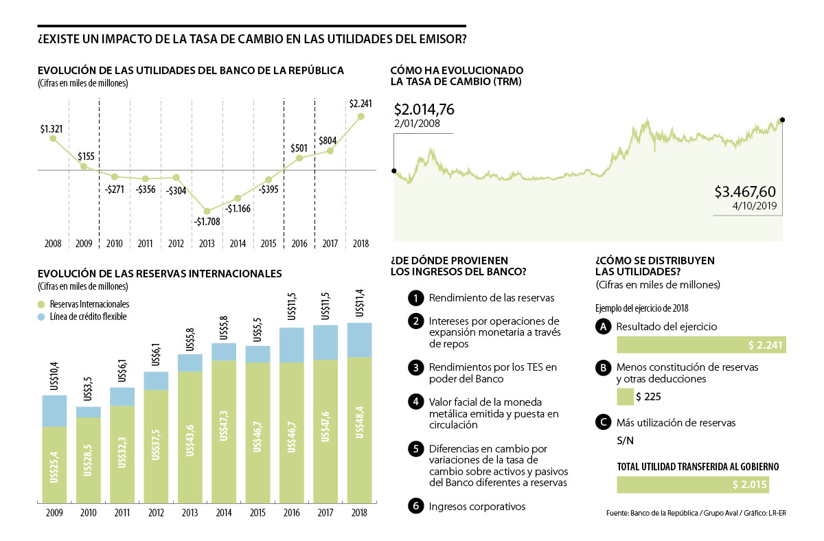 Así las cosas, cualquier variación del peso colombiano frente a la divisa estadounidense no impacta en las utilidades anuales del Banco. Lo que ocurre es que el mayor saldo de las reservas internacionales en pesos que se da por el tipo de cambio siempre se reconoce como patrimonio y, por lo cual, no tiene impacto ni tampoco se transfiere al Ministerio de Hacienda, que el año pasado recibió $2.015 millones por utilidades.