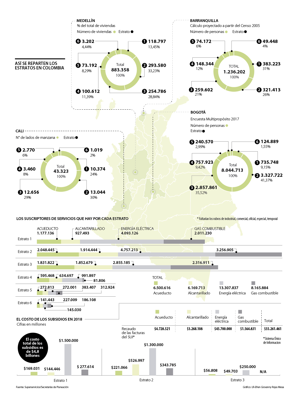 Según datos suministrados por la Superintendencia de Servicios Públicos Domiciliarios, los subsidios a los estratos 1,2 y 3 llegaron a $4,8 billones el año pasado siendo los de energía los más costosos por un valor de $3 billones, seguidos de los de alcantarillado, que supusieron $721.147 millones; los de gas representaron $621.400 millones; y los de acueducto, otros $446.960 millones.