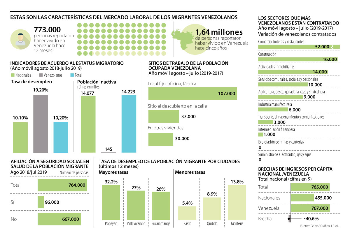 Eso significa que la tasa de desempleo de los migrantes venezolanos llegó en el último año móvil, hasta julio, a 19,2% mientras que la de los nacionales se ubicó en 10,1% y la total (incluyendo a migrantes y locales) quedó en 10,2%. “La población venezolana explica solo unos puntos básicos de la tasa de desempleo total. La posibilidad de que esté afectando estructuralmente es bastante remota”, aseguró el director del Dane, Juan Daniel Oviedo, quien reveló estos resultados extraídos de la Gran Encuesta Integrada de los Hogares.