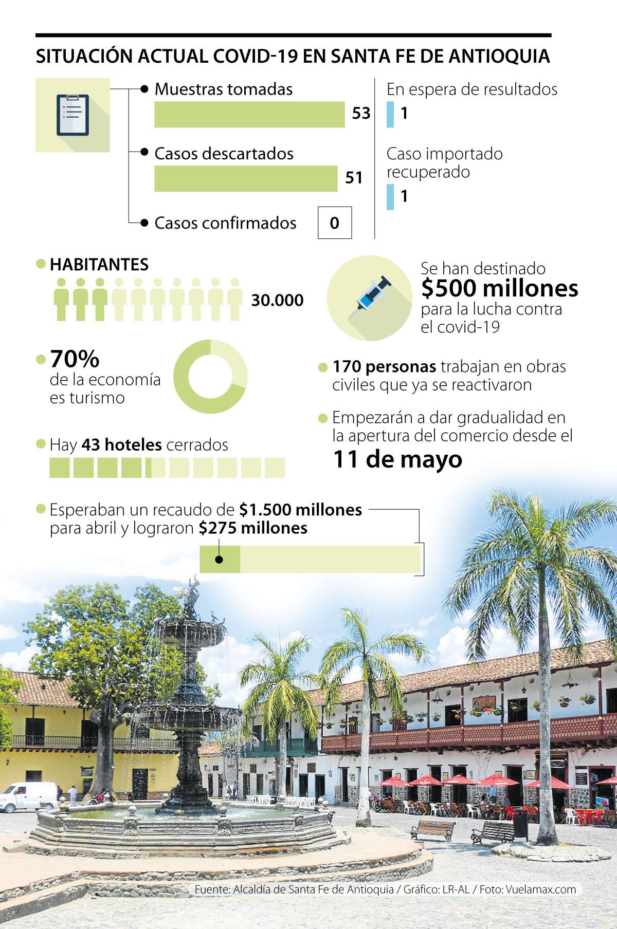 Alrededor de 860 municipios del país reportan que no tienen presencia del covid-19 en sus habitantes. Dentro de este grupo está Santa Fe de Antioquia, un municipio ubicado al noroeste de Colombia, que cuenta con 30.000 habitantes y tiene una vocación netamente turística. Según el último reporte, esta zona ha tomado 53 muestras del virus, de las cuales 51 han sido descartadas; una sigue en estudio y la restante se trata de un caso importado que ya está recuperado.