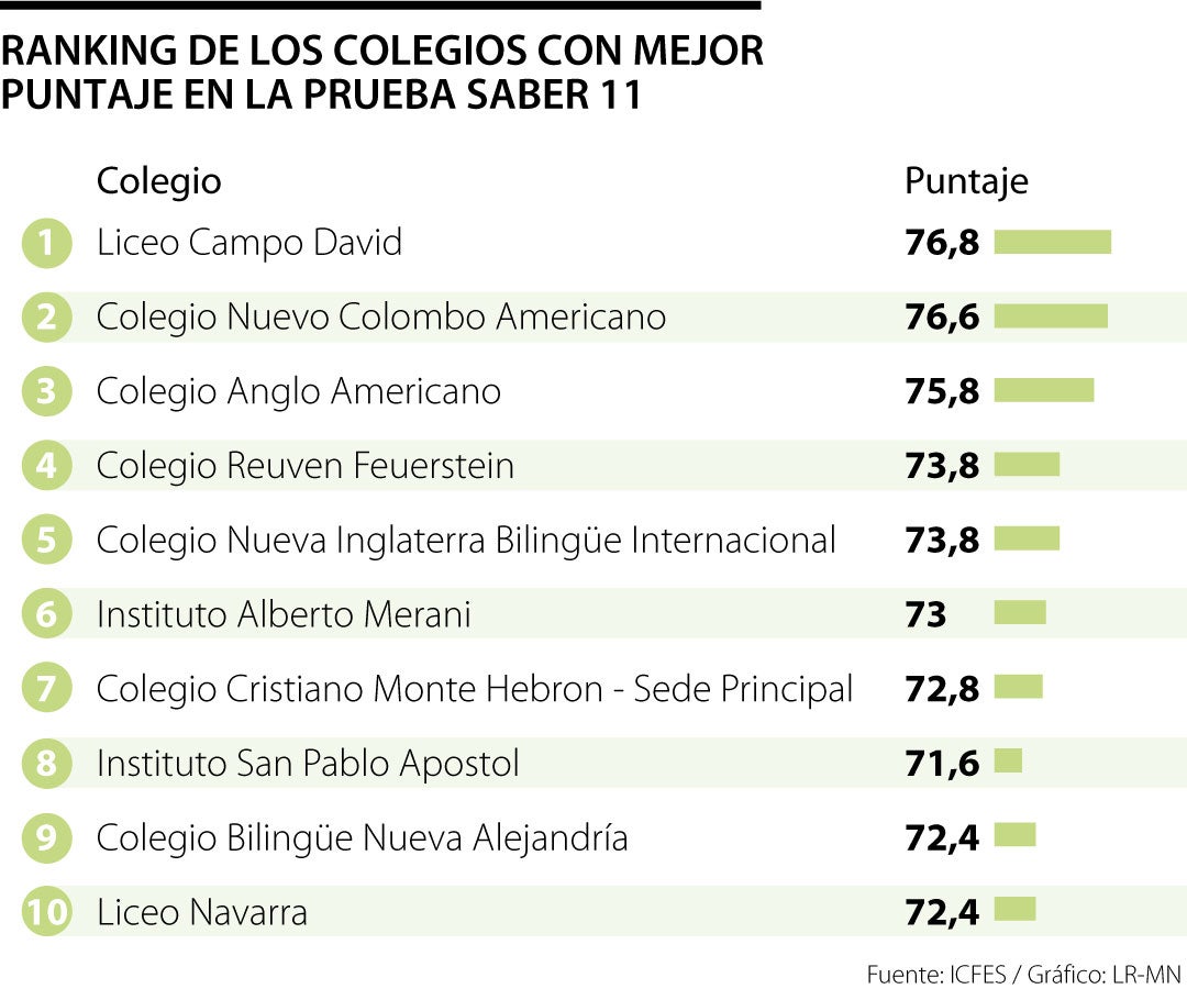 Este año, el colegio Liceo Campo David ocupó el primer lugar a nivel nacional y distrital con un puntaje global de 381,54 y un puntaje simple de 76,8. Esta institución, además, fue la que tuvo mejor desempeño en las áreas de Matemáticas con 82 puntos, Lectura Crítica con 74 puntos, Sociales y Ciudadanas con 73 puntos y Ciencias Naturales con 75 puntos.
