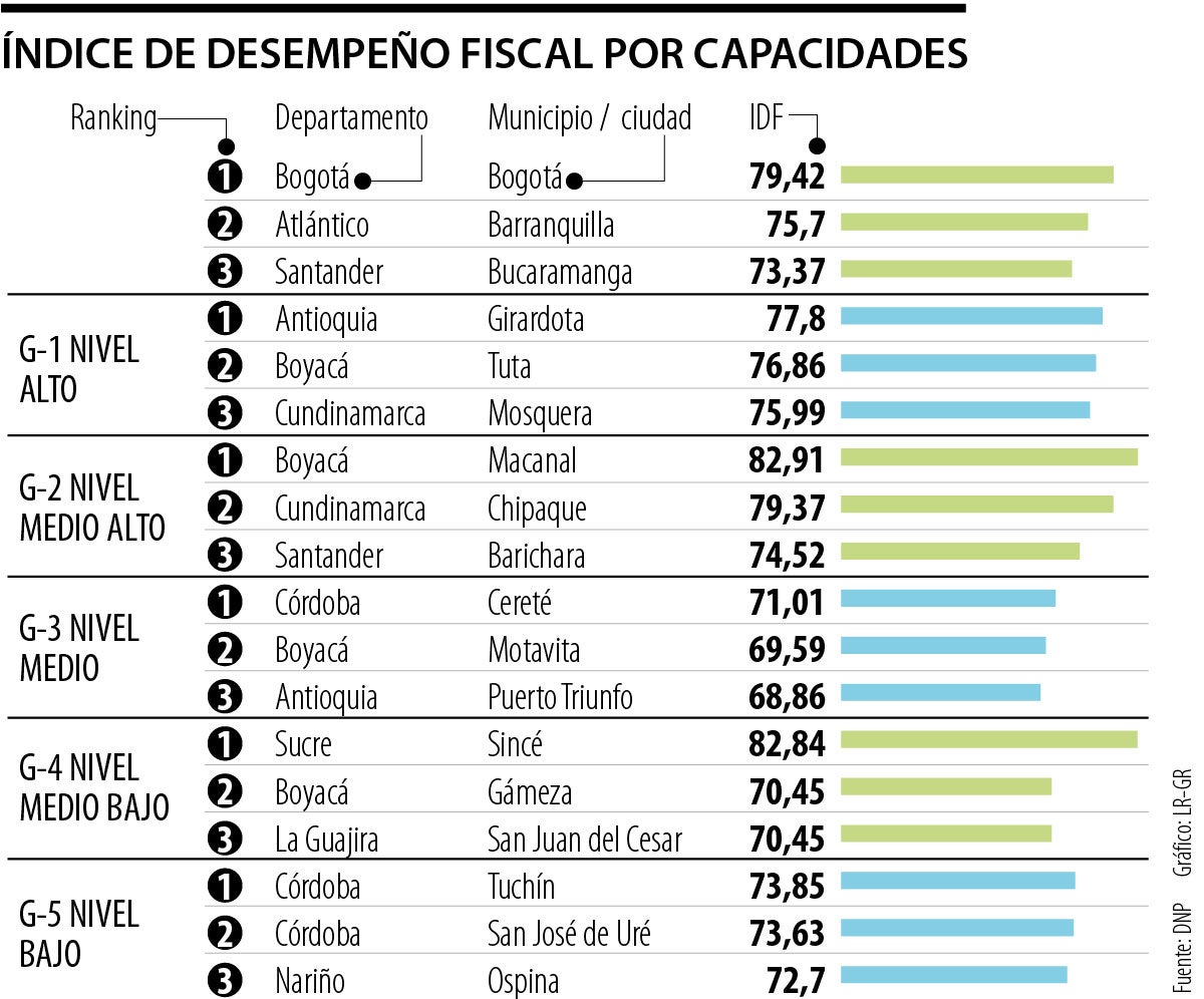Entre municipios del primer grupo, el mejor fue Girardota, en Antioquia; mientras que Macanal, en Boyacá, obtuvo los mejores resultados del grupo 2; Cereté, en Córdoba, se ubicó en primer lugar en el grupo 2; Sincé, Sucre, lideró el grupo 4, y Tuchín, Córdoba, tuvo la valoración más alta en el grupo 5.