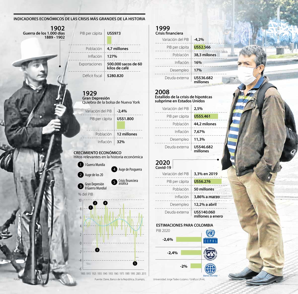 La primera crisis del Siglo XX es una de las más recordadas en la modernidad. Tras la guerra de los 1.000 días, el país experimentó una fuerte contracción de su economía en 1902. La inestabilidad política y social llevaron al incumplimiento de la deuda externa, así como a aumentar el déficit fiscal y ver desbordada la inflación. Según documentos del Banco de la República, en la guerra se emitieron millones de pesos para el financiamiento de la misma, lo que generó una hiperinflación de 127,8%.
