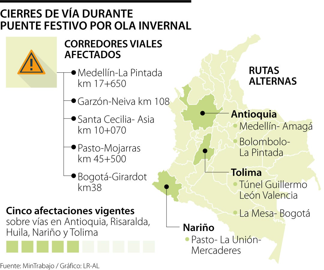 El ministro de Transporte, Guillermo Reyes, dio a conocer que en total en esta puente festivo 5 corredores viales han presentado inconvenientes en su movilidad, principalmente por deslizamientos de tierra. Además de la vía Bogotá-Girardot, han tenido afectaciones los corredores de Medellín- La Pintada, Garzón-Neiva, Santa Cecilia- Asia y Pasto-Mojarras.