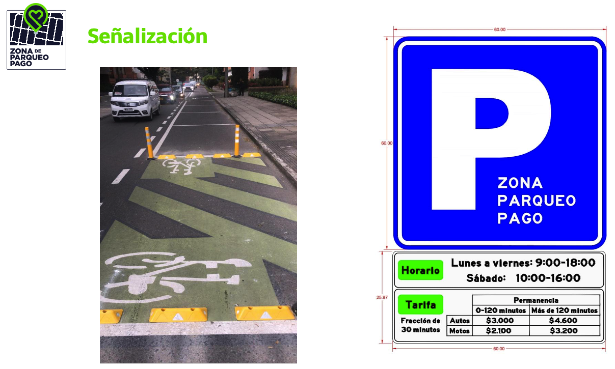 Para identificar las zonas habilitadas se podrá observar una delimitación sobre la vía de color blanco y la presencia de señalización cercana en color azul en la cual se pueden leer las tarifas y horarios.