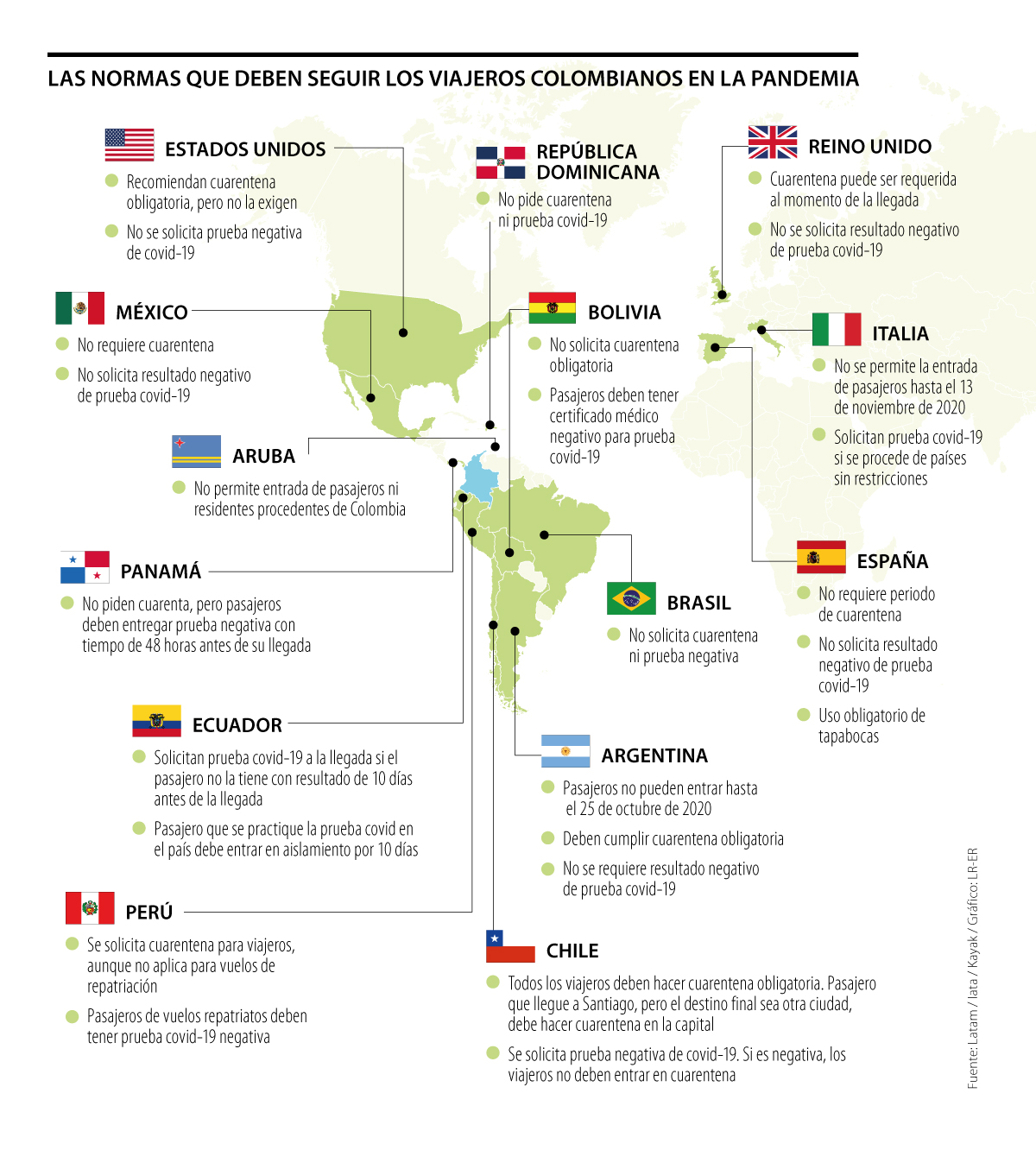 Aunque estas condiciones suelen cambiar casi semanalmente, por legislación y número de contagiados, tanto Migración Colombia como la Aeronáutica Civil no cuentan con el listado oficial de países que tienen o no restricciones. Por ello, LR hizo un sondeo basándose en las plataformas Smartvel, con datos de la Asociación Internacional de Transporte Aéreo (Iata), y Kayak para saber cuáles son las restricciones de cada territorio para los viajeros que salen del país. (ver gráfico).