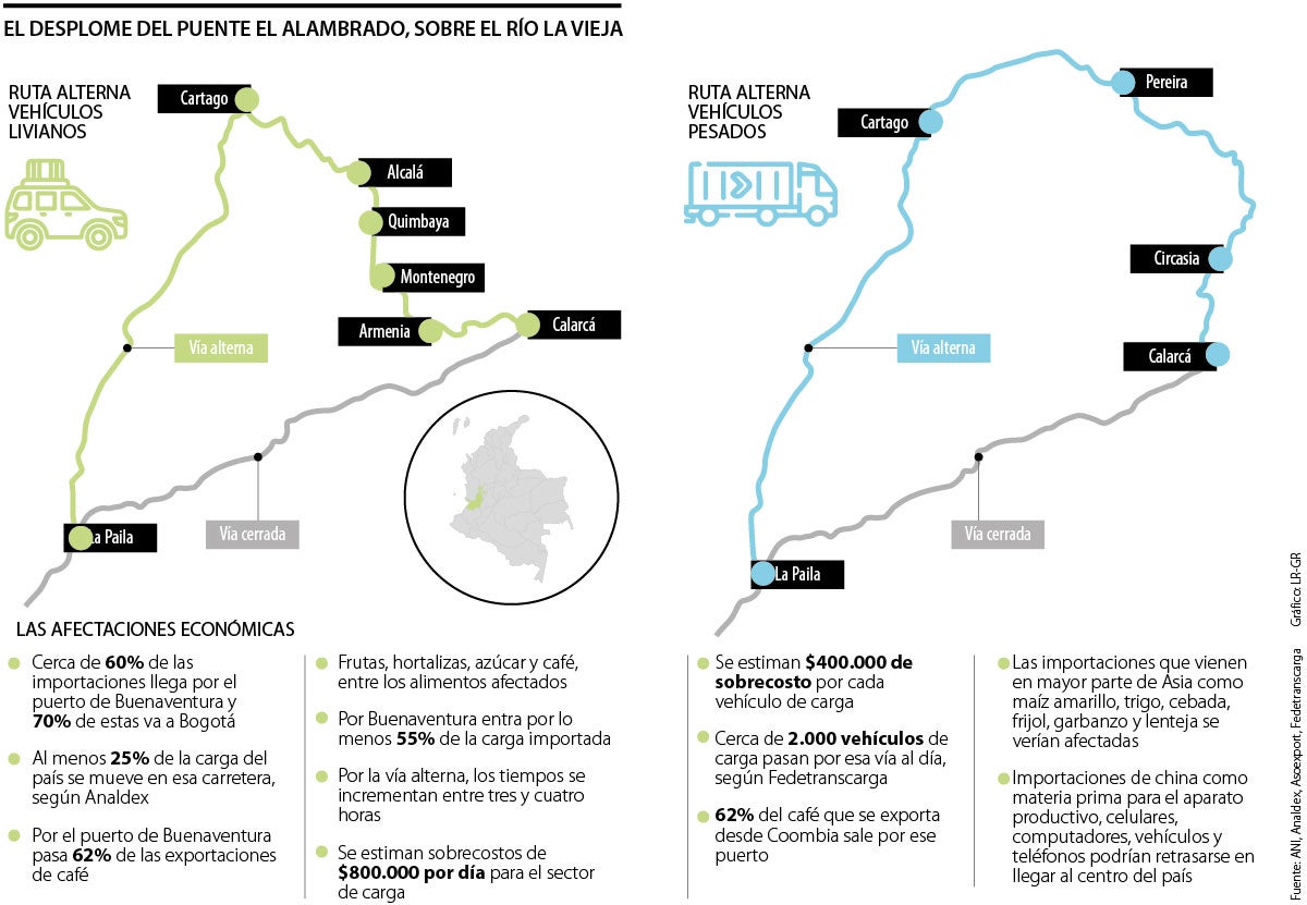 El punto neurálgico, además, tendrá un impacto en los costos de alimentos. Jorge Bedoya, presidente de la Sociedad de Agricultores de Colombia (SAC), indica que “es la vía que se utiliza para transportar los productos desde el Valle del Cauca o de Nariño hacia el centro del país y el Eje Cafetero, pero no solamente se trata de estos alimentos, sino también de una gran cantidad de insumos que suben desde Buenaventura hacia Tolima, Cundinamarca y el Eje Cafetero, y que también se mueven normalmente por esa carretera”.
