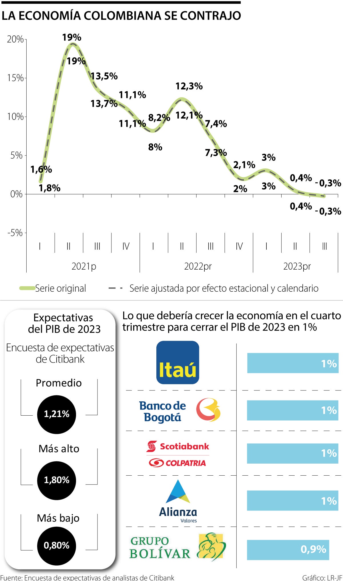 Este diario consultó con varios analistas sobre el dato con el que debería cerrar el año para que la economía crezca por lo menos 1%. Grupo Bolívar calculó 0,9%, Banco de Bogotá 1%, Alianza Valores 1%, Scotiabank Colpatria 1% e Itaú 1%.
