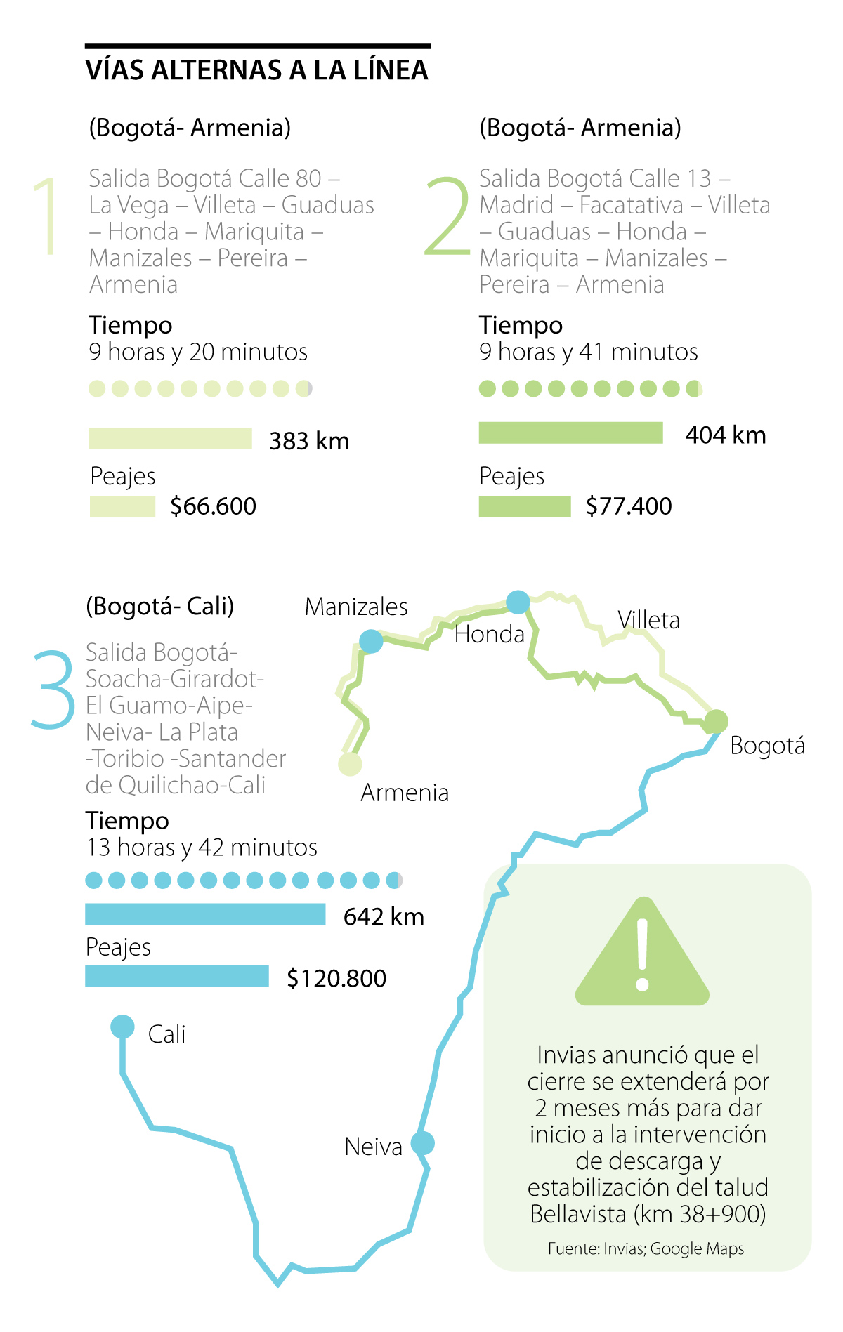 Por ejemplo, si una persona tomaba la vía normal que conduce de Bogotá a Armenia debía recorrer 281 kilómetros y pagar alrededor de $45.600 en peajes, mientras que, si toma alguna de las rutas que atraviesan el Alto de Letras, ubicado en Manizales, deberá recorrer entre 380 y 400 kilómetros y pagar más de $75.000 en peajes.