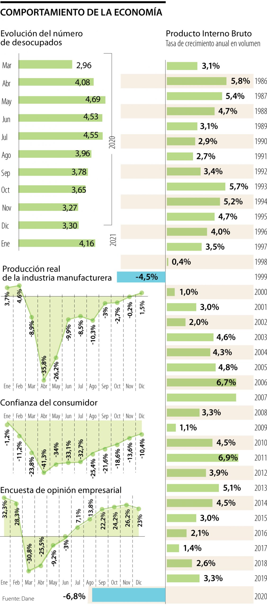 Hace 365 días nadie hubiera imaginado que la pandemia del covid-19, que apenas estaba por afectar a su primera víctima en Colombia, esa mujer de 19 años que llegó procedente de Milán (Italia) y que se convirtió el 6 de marzo de 2020 en el primer contagio oficial, dejara un cóctel explosivo en una economía que buscaba mantener el impulso de crecimiento.