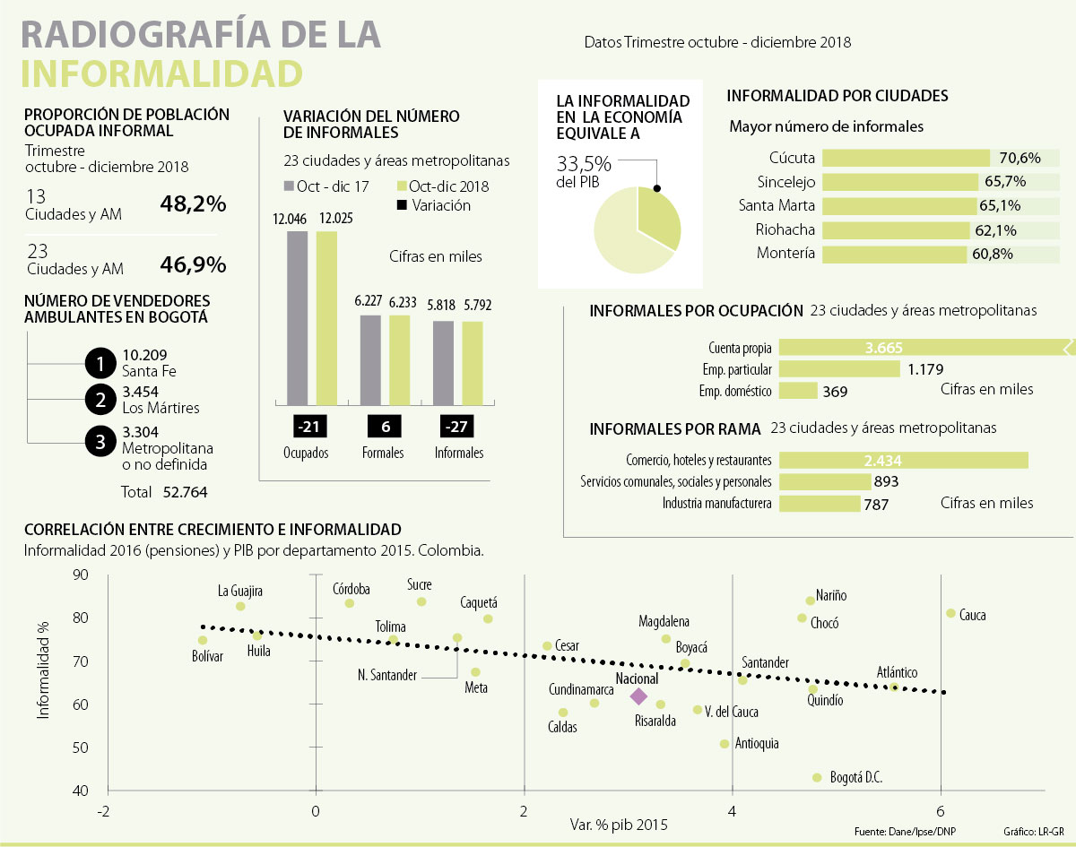 En total, el Departamento Administrativo Nacional de Estadística (Dane) estimó que la informalidad en las 23 ciudades y áreas metropolitanas llegó a 48,2% el año pasado, lo que significa que el número de trabajadores informales fue de 5,7 millones. Sin embargo, a nivel nacional la cifra de personas que trabajan en la economía del rebusque sobrepasa los 10 millones siendo Cúcuta, Sincelejo y Santa Marta las ciudades con el mayor número de informales.