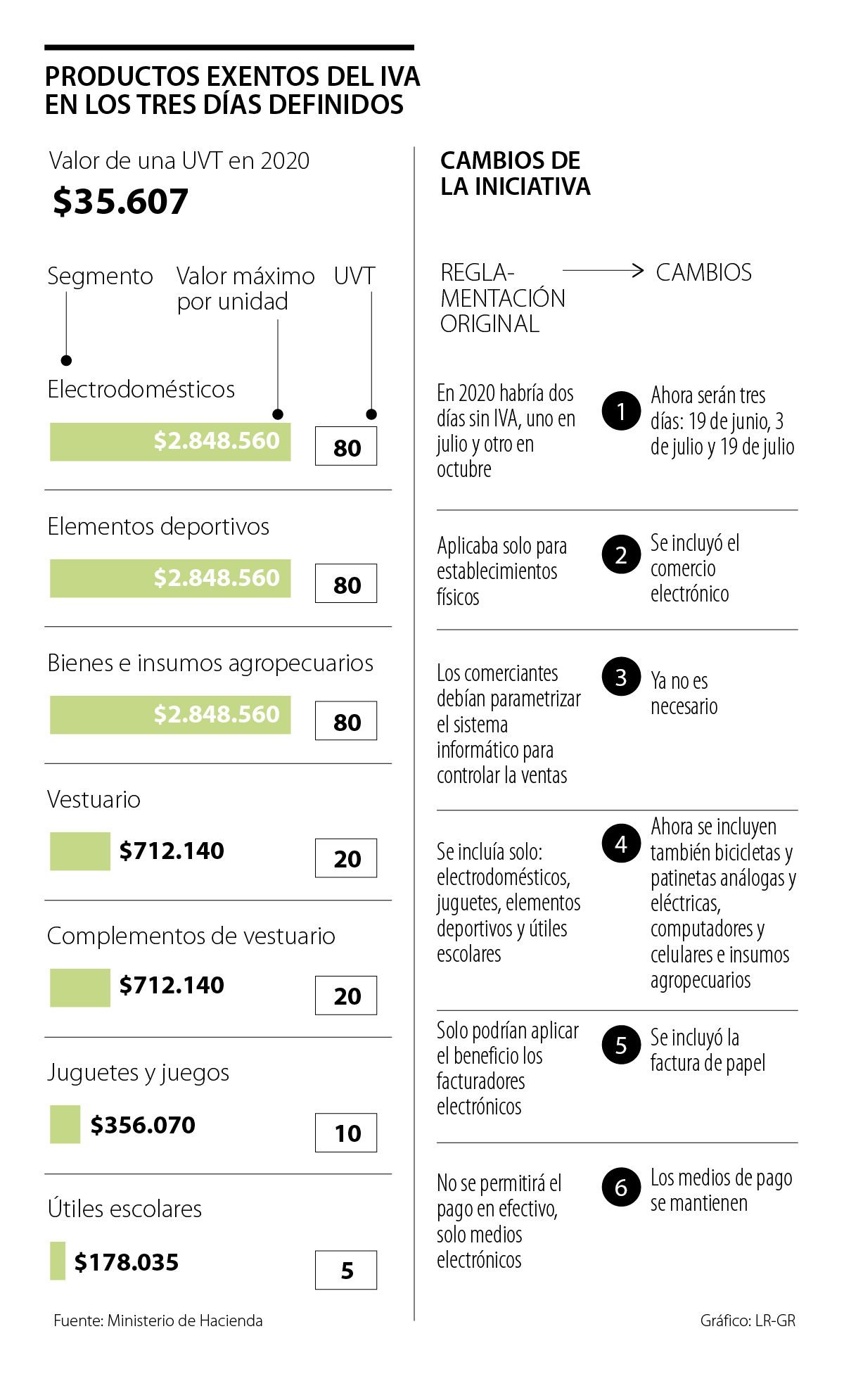 Lo anterior significa que para todas las manufacturas que están por fuera del Decreto 682 del 21 de mayo de 2020, que reglamenta la iniciativa, se seguirá cobrando el mencionado impuesto ese día, así como el 3 de julio y el 19 de julio, que son las fechas adicionales previstas para este año, en las que no se pagará IVA por el mencionado grupo de productos.