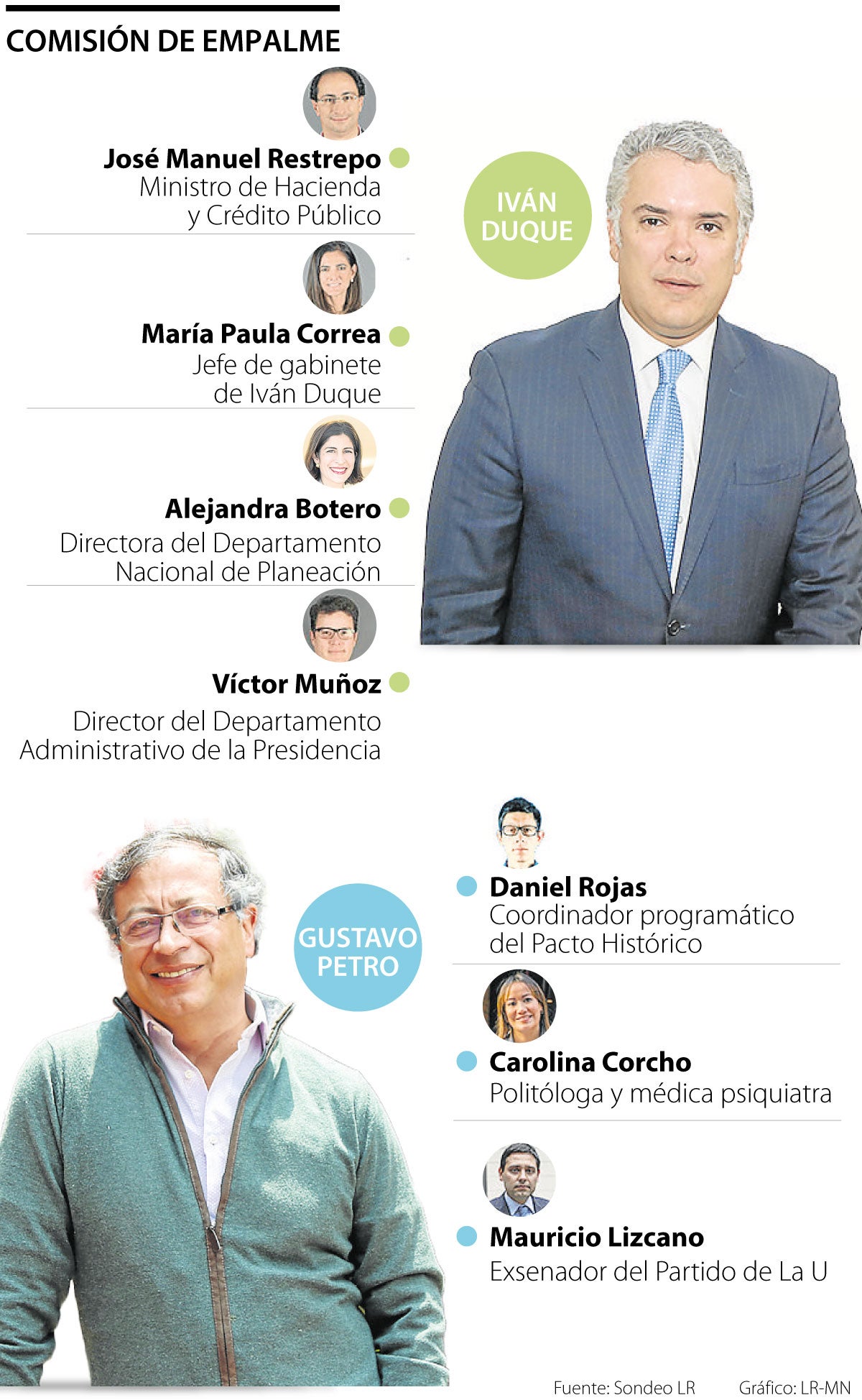 Entre las figuras designadas por Petro para el empalme, se destaca Daniel Rojas, quien se desempeña como coordinador programático del Pacto Histórico. Sobre él se sabe que es conocedor de los temas económicos y que busca perfilar la imagen del presidente electo en un modelo, a su juicio, lejos de parecerse al de Venezuela. También aparece Carolina Corcho, quien además de desempeñarse como médica y asesora de Petro, ha sido reconocida por ser una activista y defensora de los derechos de los colombianos en materia de salud, proponiendo una reforma que contempla cambios en el sistema. Por su trayectoria, se presume que pueda ser la nueva titular del Ministerio de Salud.