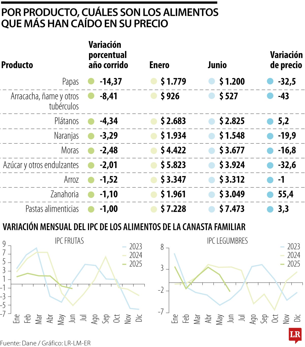 Por su parte, el exministro de Agricultura, Andrés Valencia, coincidió en que la baja de precio de alimentos como la papa, la arracacha, las moras, entre otros, se debe principalmente a que están en cosecha. “Por un escenario de oferta abundante, han venido cayendo los precios de alimentos tanto en la inflación anual, como la mensual, como se demostró en junio”.