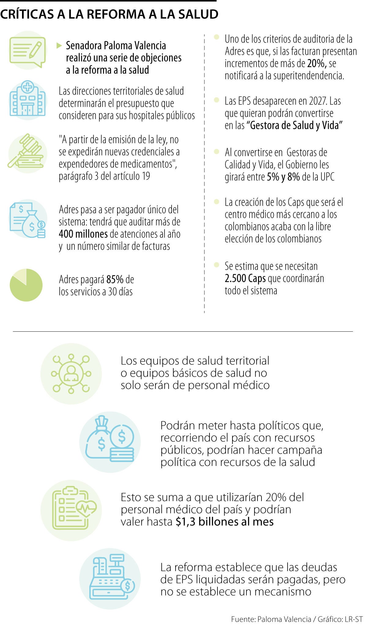 La senadora Paloma Valencia expuso una serie de críticas al texto de la reforma, que generan alarmas en distintos ámbitos porque se habla de una posible inestabilidad en los próximos años, entre ellas, con respecto a droguerías, EPS, política, entre otras dependencias.