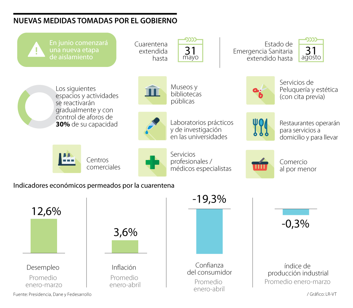 Ante el anuncio de la ampliación de la cuarentena, Jaime Alberto Cabal, presidente de Fenalco, celebró la noticia al señalar que los empresarios verán “una luz al final del túnel”, pero le pidió al Gobierno claridad sobre cuáles serán los subsectores del comercio que podrán retomar actividades el 1 de junio, de modo que puedan preparar los protocolos con anterioridad “y evitar empezar a trabajar tres semanas después”, señaló.