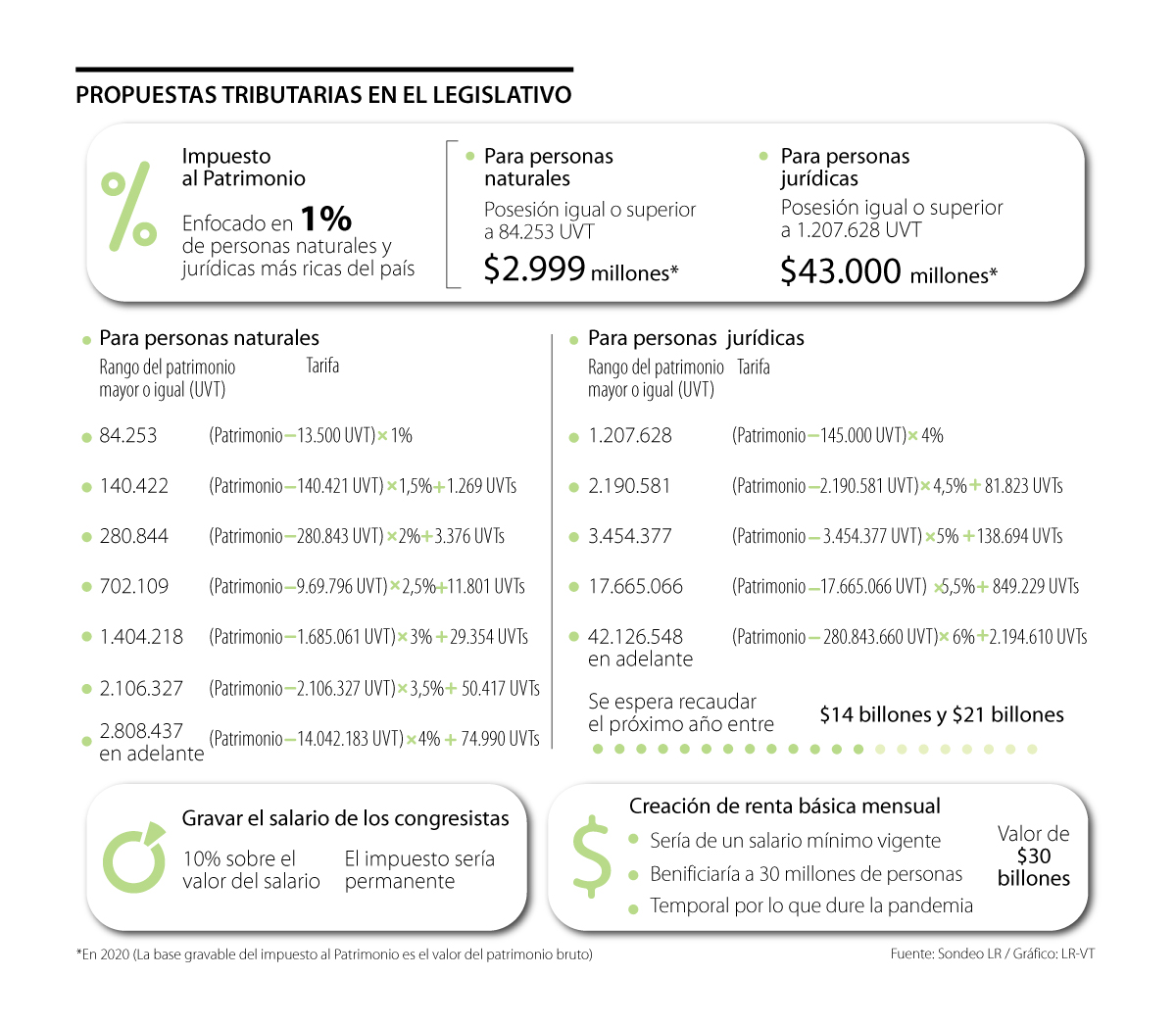 El proyecto más completo hasta ahora fue firmado por 42 senadores de la oposición. En este se propone la creación del impuesto al patrimonio para personas que posean bienes avalados desde $2.999 millones y, en el caso de las personas jurídicas, desde $79.999 millones en 2020 (ver gráfico).