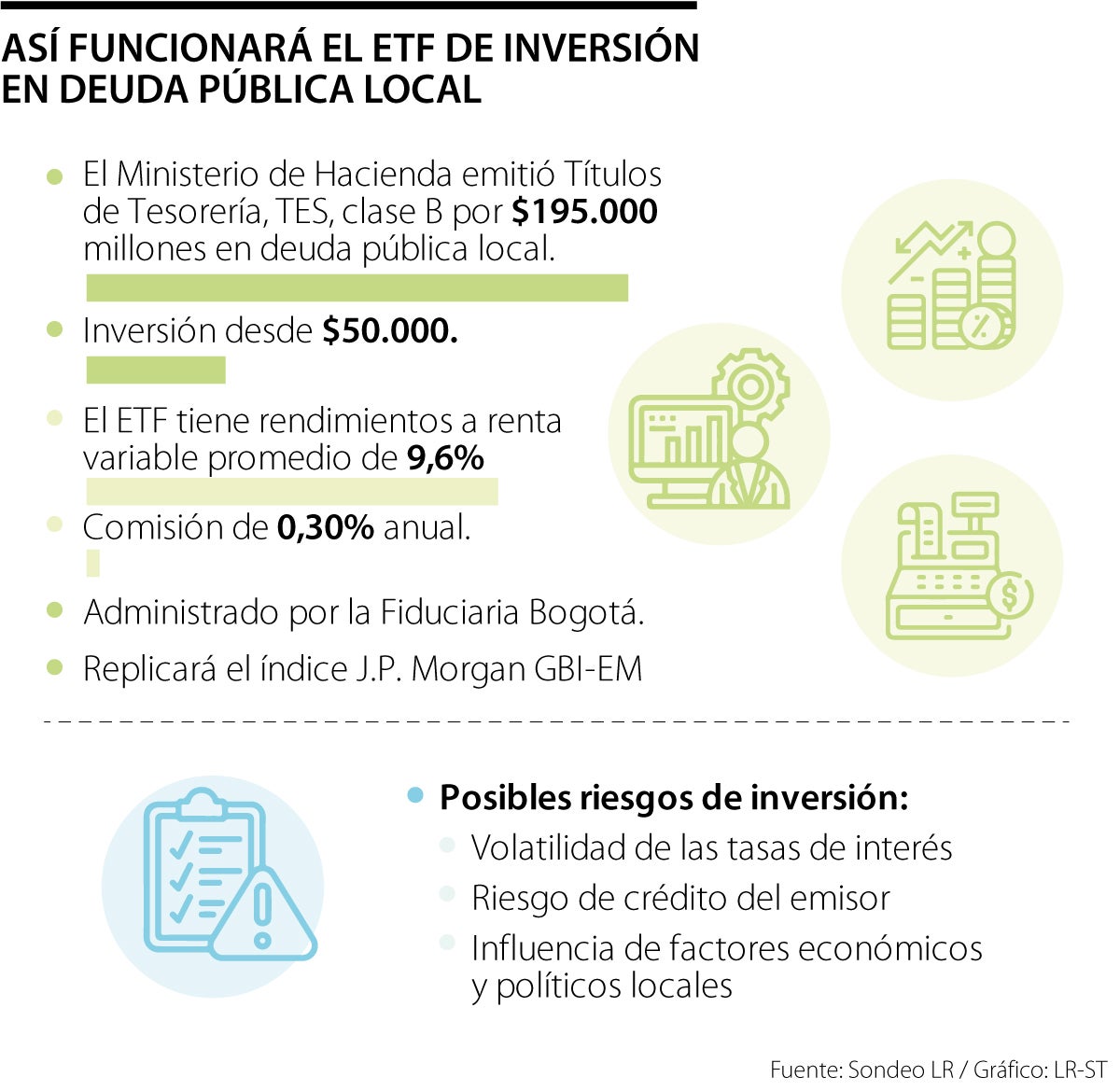 El fondo Global X Tes Colombia ETF permite la inversión desde $50.000 con rendimientos a renta variable promedio de 9,6% y cobrará una comisión de 0,30% anual, administrado por la Fiduciaria Bogotá. Además, contará con un retorno total de la inversión y los intereses se reinvertirán cada año. Además, su garantía replicará el índice J.P. Morgan GBI-EM.