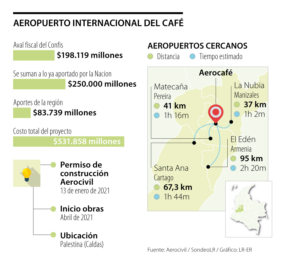 El nuevo terminal aéreo está ubicado en Palestina (Caldas) y, si bien está planteada la eliminación de La Nubia, en este momento hay cuatro aeropuertos a menos de 100 km de distancia del lugar donde se construirá el Aerocafé. Además del de Manizales, también están: el Aeropuerto Internacional Matecaña, en Pereira (Risaralda), a 41 km y una hora 16 minutos; el Aeropuerto Santa Ana, en Cartago (Valle), a 67,3 km y una hora 44 minutos; y el Aeropuerto Internacional El Edén, en Armenia (Quindío), a 95 km y dos horas 20 minutos.