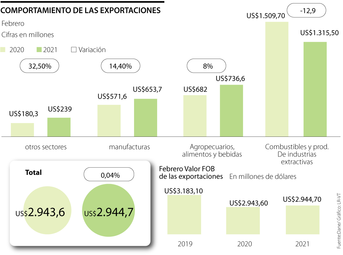 El Departamento Administrativo Nacional de Estadística (Dane) entregó ayer los resultados de las exportaciones de Colombia en febrero y tras 13 meses de presentar datos negativos las ventas externas del país llegaron a US$2.944,7 millones, lo que representa un alza de 0,04% frente al mismo mes de 2020.