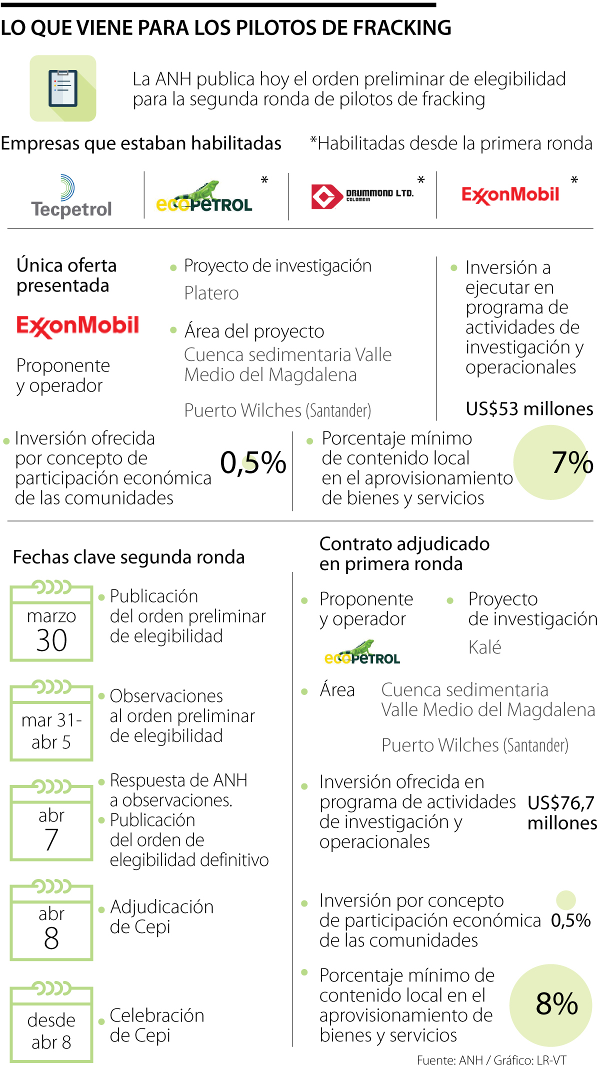Los pilotos de fracking en el país siguen avanzando y prueba de ello es que, tras haber recibido una oferta de ExxonMobil en la segunda ronda de adjudicación de Contratos Especiales de Proyectos de Investigación (Cepi), la Agencia Nacional de Hidrocarburos (ANH) publicará hoy el orden preliminar de elegibilidad para seguir adelantando los Proyectos Piloto de Investigación Integral (Ppii) en Yacimientos No Convencionales (YNC).