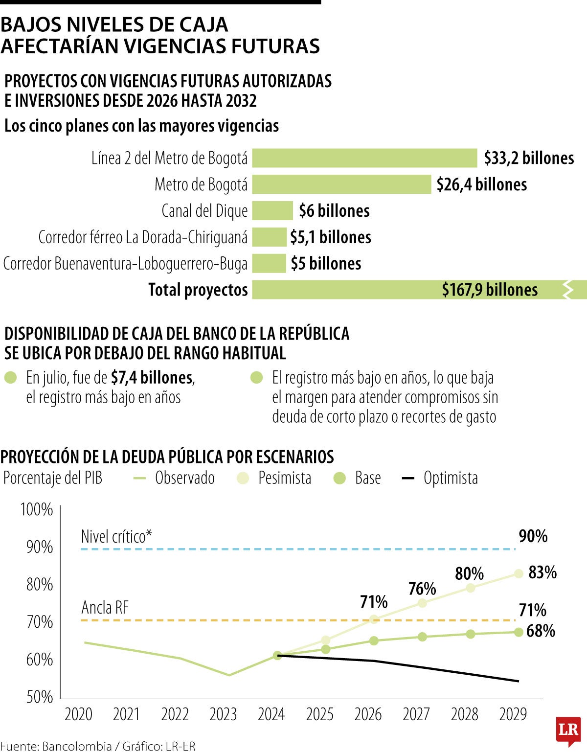 A este panorama se suman las debilidades en los recursos disponibles en la caja del Banco de la República. Según Bancolombia, la disponibilidad de recursos fue de $7,4 billones en julio de 2025, uno de los niveles más bajos en años; esto reduce la maniobrabilidad del Estado para atender compromisos sin recurrir a más deuda o a recortes de gasto, afectando directamente las vigencias futuras.