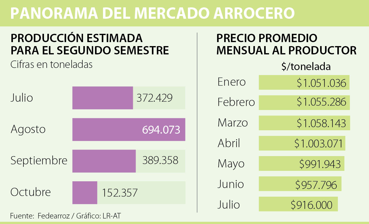 Las proyecciones estimadas de Fedearroz señalan que la segunda cosecha del año (julio - octubre) llegará a 1,6 millones de toneladas, teniendo el pico máximo de producción en agosto con 694.073 toneladas. Cifra que podría agudizar la crisis del gremio, si no se agiliza el proceso de adjudicación y concertación del incentivo al almacenamiento, uno de los pactos establecidos para levantar la movilización en junio.