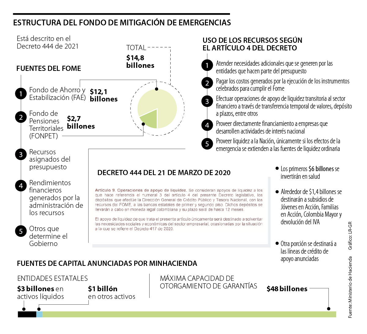De acuerdo con el ministro de esa cartera, Alberto Carrasquilla, se dispondrá de $14,8 billones para tal fin, extraídos principalmente del Fondo de Ahorro y Estabilización (FAE), con $12,1 billones y del Fondo de Pensiones Territoriales (Fonpet), con $2,7 billones.