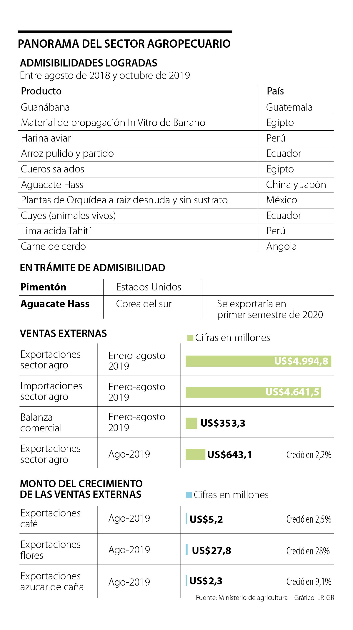 De hecho, Valencia anunció que en el primer semestre de 2020 se harán las primeras exportaciones de este producto a Corea del Sur. Por otro lado, el jefe de cartera subrayó que entre agosto de 2018 y septiembre de 2019 se han colocado $19,9 billones en crédito agropecuario, lo que significó un incremento de 11% frente a ese periodo anterior.