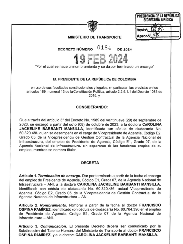 El decreto establece que se da "por terminado a partir de la fecha el encargo del empleo de Presidente de Agencia, Código E1, Grado 07, de la Agencia Nacional de Infraestructura - ANI, a la doctora Carolina Jackeline Barbanti, actual vicepresidente de Agencia".