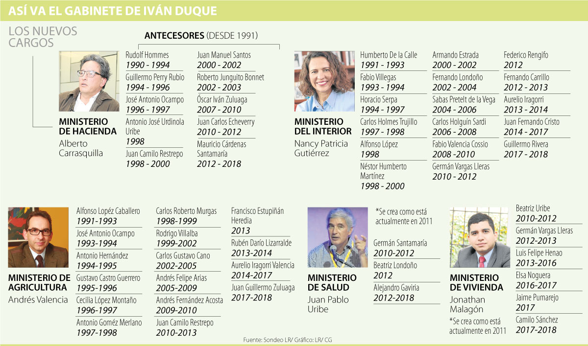 El primer ministro asegurado fue Alberto Carrasquilla, quien estará por segunda vez en el Ministerio de Hacienda, pues ya había ocupado este cargo entre 2003 y 2007. Al nombramiento de Carrasquilla le siguió el del economista Andrés Valencia, actual presidente de la Federación Nacional de Avicultores (Fenavi), quien recibió el visto bueno de agremiaciones como Fedearroz, quienes destacaron que “cuenta con el perfil técnico y la experiencia que requiere el sector agropecuario para enfrentar los enormes retos que aún tiene”.