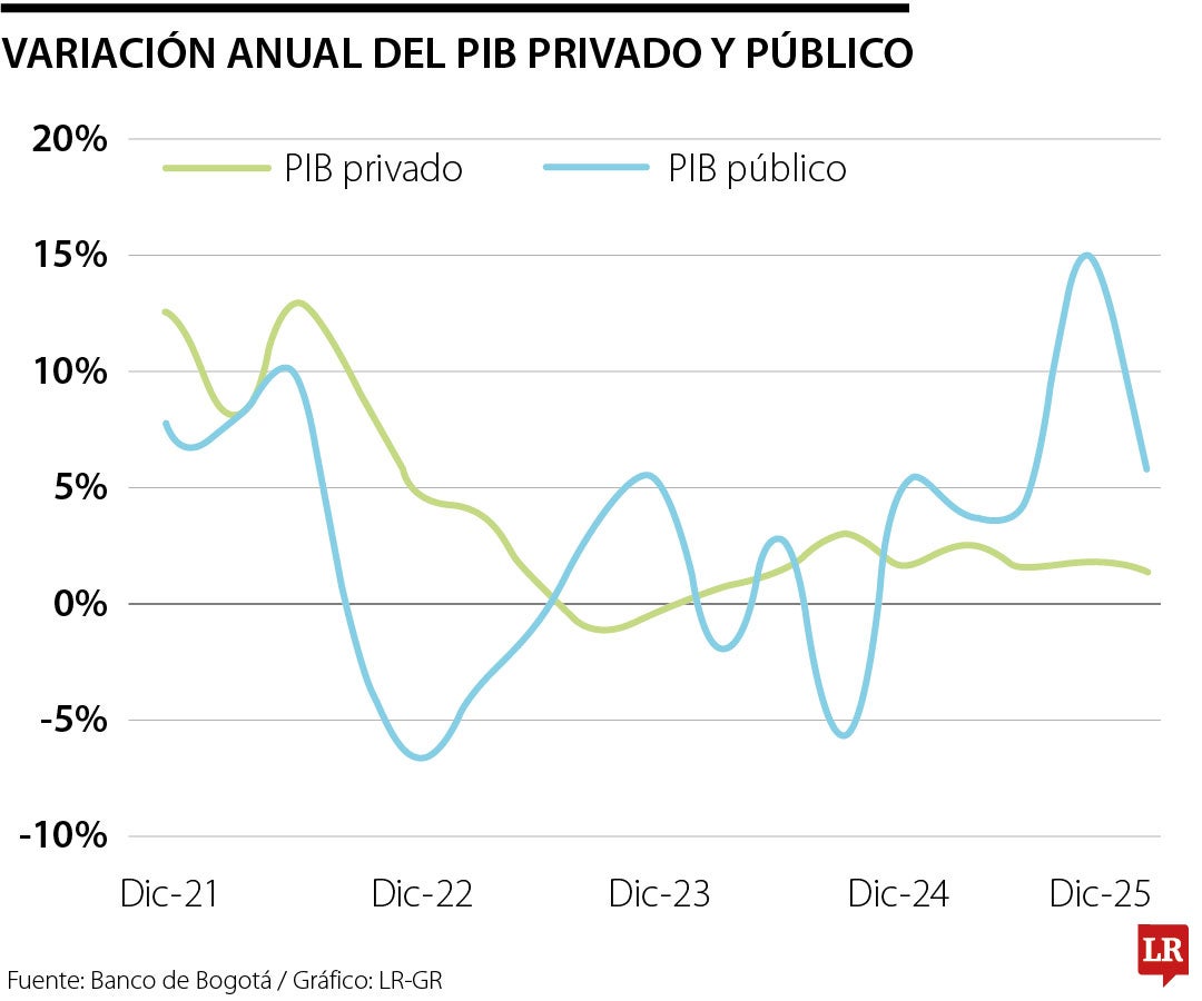 Luego de conocerse el dato con las cifras de crecimiento de la economía colombiana correspondientes al cuarto trimestre de 2025 y al total del año las cuales muestran una expansión de 2,3% en el periodo octubre-diciembre y de 2,6% en el acumulado anual, el Banco de Bogotá realizó un análisis en el cual muestra la divergencia entre el PIB público y el privado.