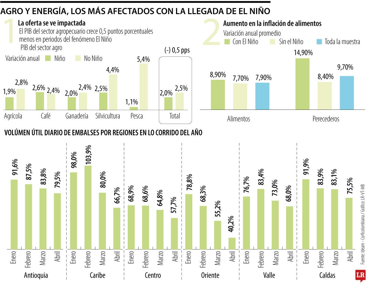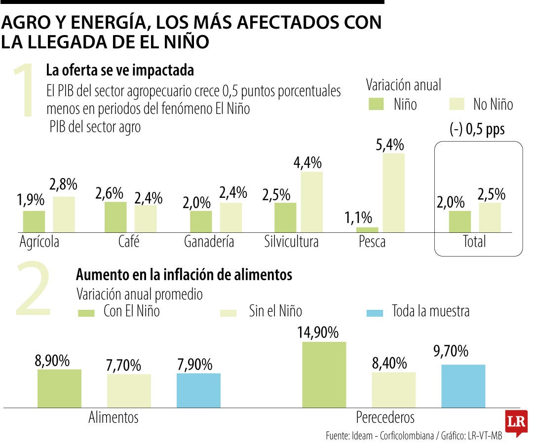 Una de las consecuencias de un fenómeno como este es la afectación de los cultivos debido a las sequías. Según un análisis de Corficolombiana, un Niño fuerte puede elevar la inflación de alimentos, en promedio, en 3,9 puntos porcentuales. Por su parte, en el sector energético, la falta de lluvias puede reducir de forma drástica los caudales de agua, lo que limita la producción hidroeléctrica y, en consecuencia, eleva los precios en la bolsa de energía.