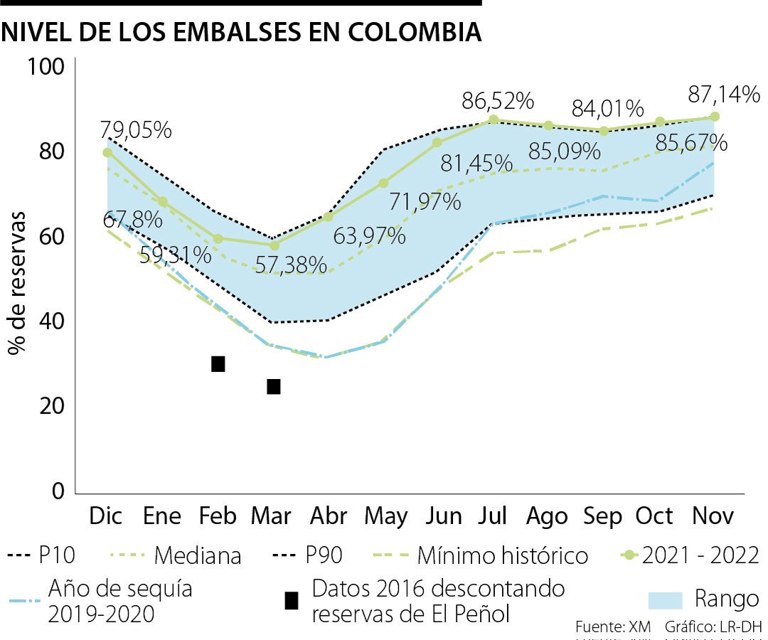 Actualmente el nivel de los embalses en Colombia está en sus máximos históricos, ya que desde que se tiene registro diciembre nunca había iniciado con tantas reservas de agua, pues este mes comenzó con 87,14%, mientras que en el último mes de años anteriores se ubicaba en 79,05%.