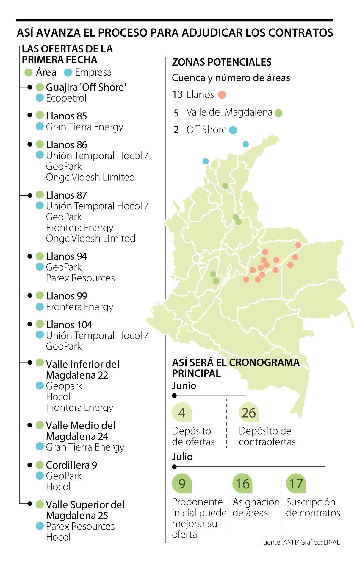 En esta primera ronda, siete empresas, de las 22 habilitadas, presentaron las primeras ofertas por los bloques. En esta puja, GeoPark, Hocol y la unión temporal de estas dos firmas, lideraron las propuestas con tres ofertas cada una. Aunque inicialmente aún faltan dos meses para definirse si se quedan o no con los bloques, la ANH aseguró que esto es un buen síntoma para reactivar la industria en el país.