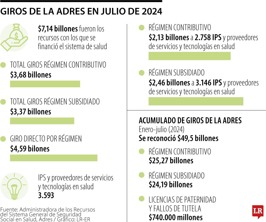 Según la entidad, el acumulado de enero y julio de 2024 en asignaciones fue $49,4 billones; $22,5 billones fueron para el régimen contributivo y $21 billones para el subsidiado