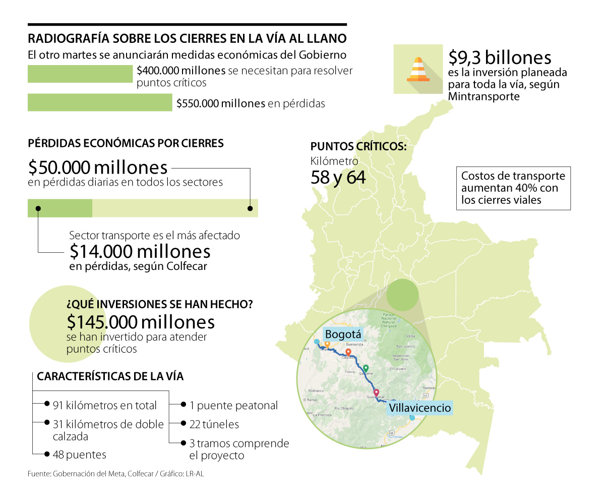 La situación a la que se han enfrentado los transportadores y viajeros detenidos en la vía Bogotá-Villavicencio, por los constantes cierres viales y deslizamientos, fue uno de los motivos que llevó a los gobernadores del Meta, Guainía, Arauca y Guaviare a exigir un poco más de $400.000 millones para atender la contingencia. Pese a que el Gobierno Nacional aseguró que la próxima semana se anunciarán nuevas medidas económicas, desde los departamentos se añadió que la crisis en este tramo ya deja pérdidas por más de $550.000 millones.